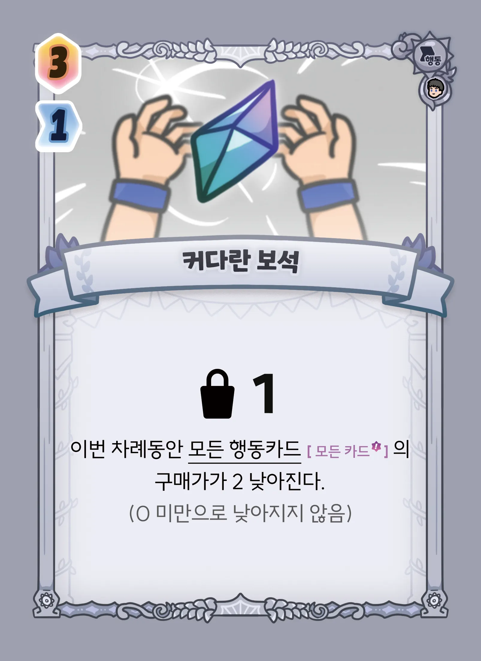 : (커다란 보석을 1장만 사용했다면) 행동카드를 공개하려 하는 경우 원래의 구매가가 8 이상인 카드를 공개해야 효과 시전을 막을 수 있습니다. 무기카드와 재화카드는 구매가가 변화하지 않으므로 이 종류의 카드들은 구매가 6 이상인 카드를 공개해도 됩니다.