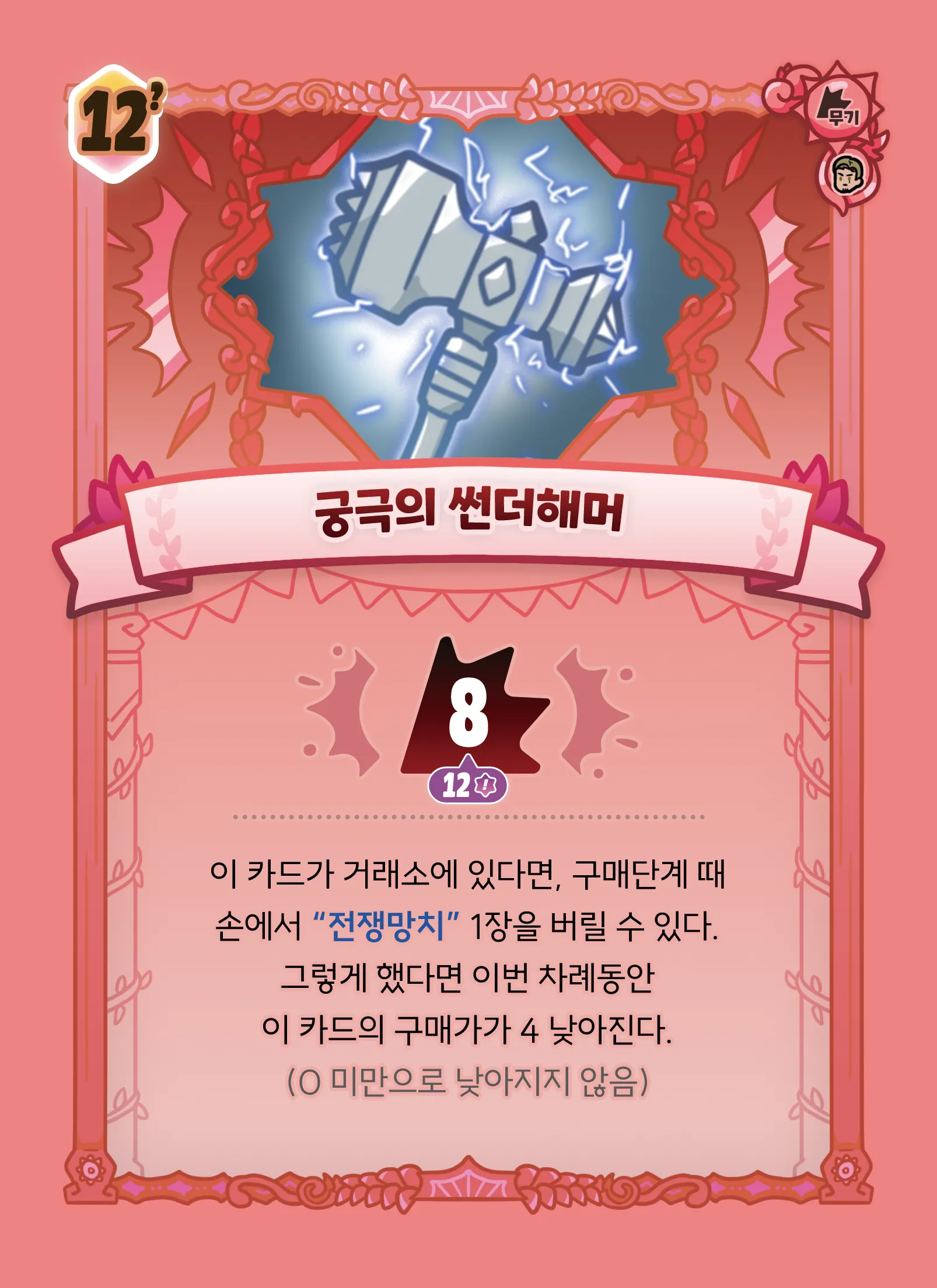 피해량. —— 이 카드가 거래소에 있다면, 구매단계 때 손에서 “전쟁망치” 1장을 버릴 수 있다. 그렇게 했다면 이번 차례동안 이 카드의 구매가가 4 낮아진다. (0 미만으로 낮아지지 않음)