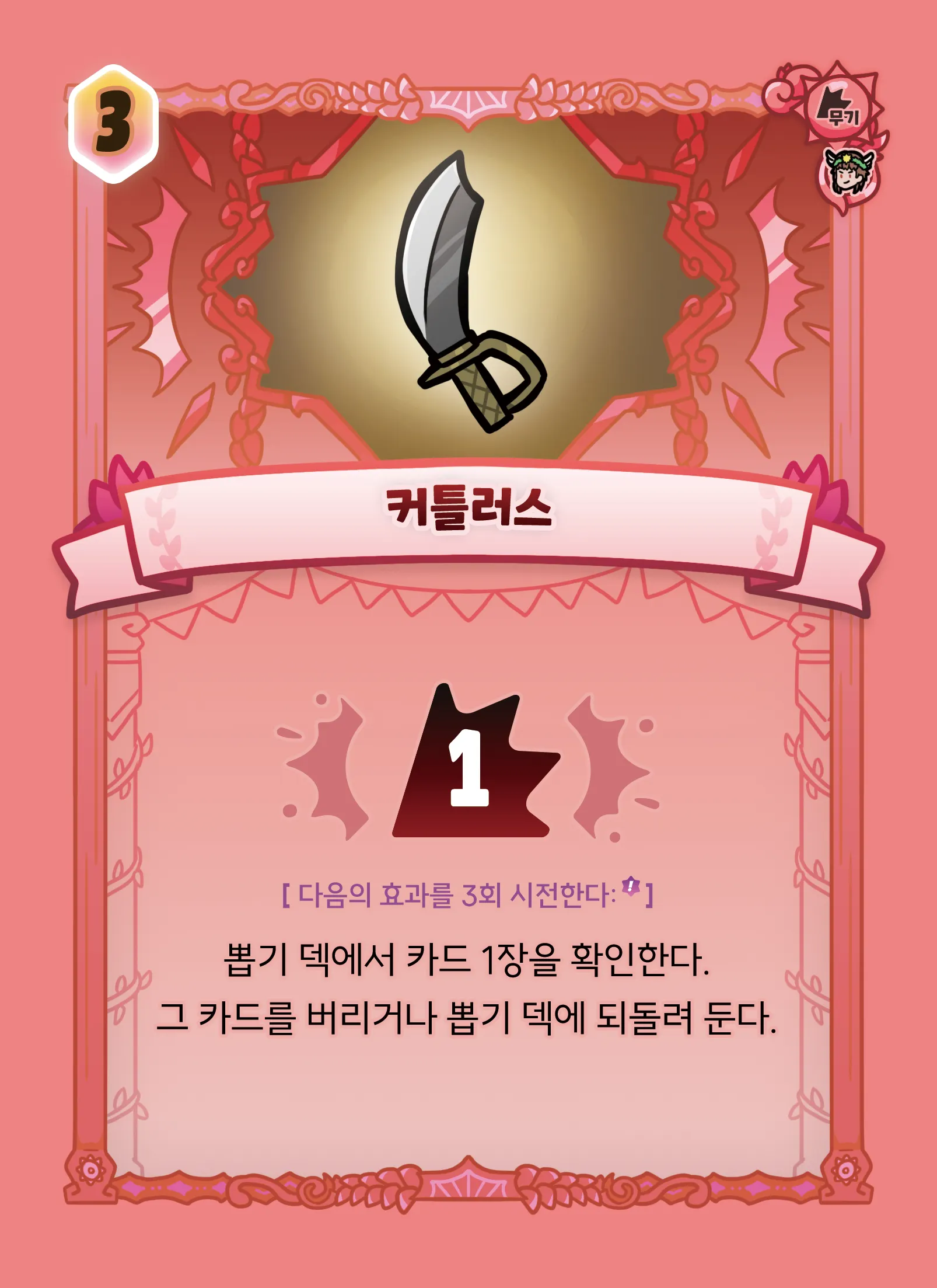 뽑기 덱에서 카드 1장을 확인한다. 그 카드를 버리거나 뽑기 덱에 되돌려 둔다.
