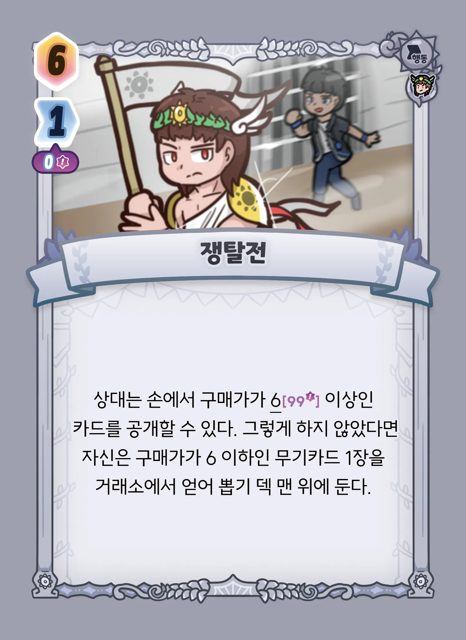 이상인 카드를 공개할 수 있다. 그렇게 하지 않았다면 자신은 구매가가 6 이하인 무기카드 1장을 거래소에서 얻어 뽑기 덱 맨 위에 둔다.