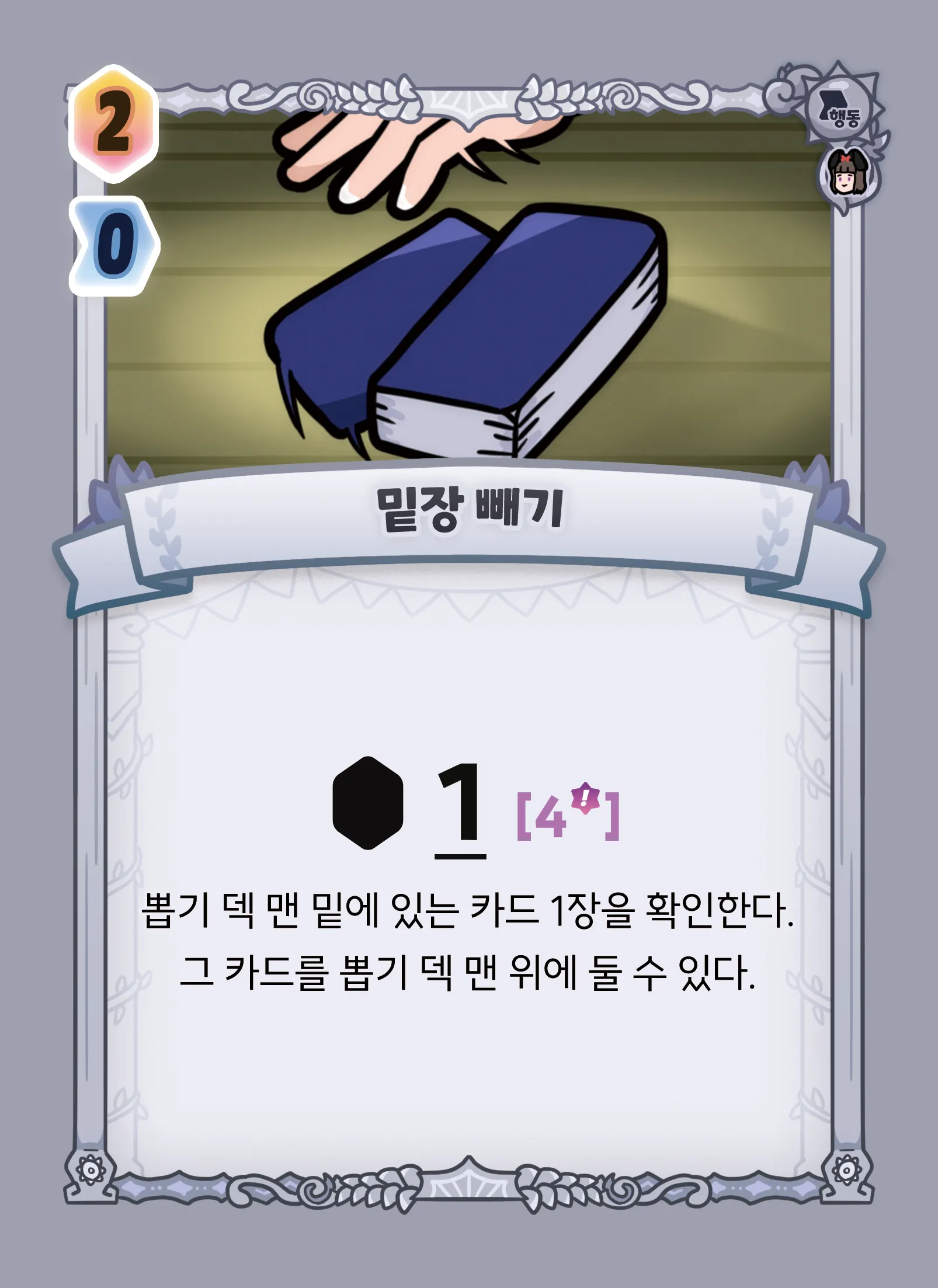 젬, 뽑기 덱 맨 밑에 있는 카드 1장을 확인한다. 그 카드를 뽑기 덱 맨 위에 둘 수 있다.
