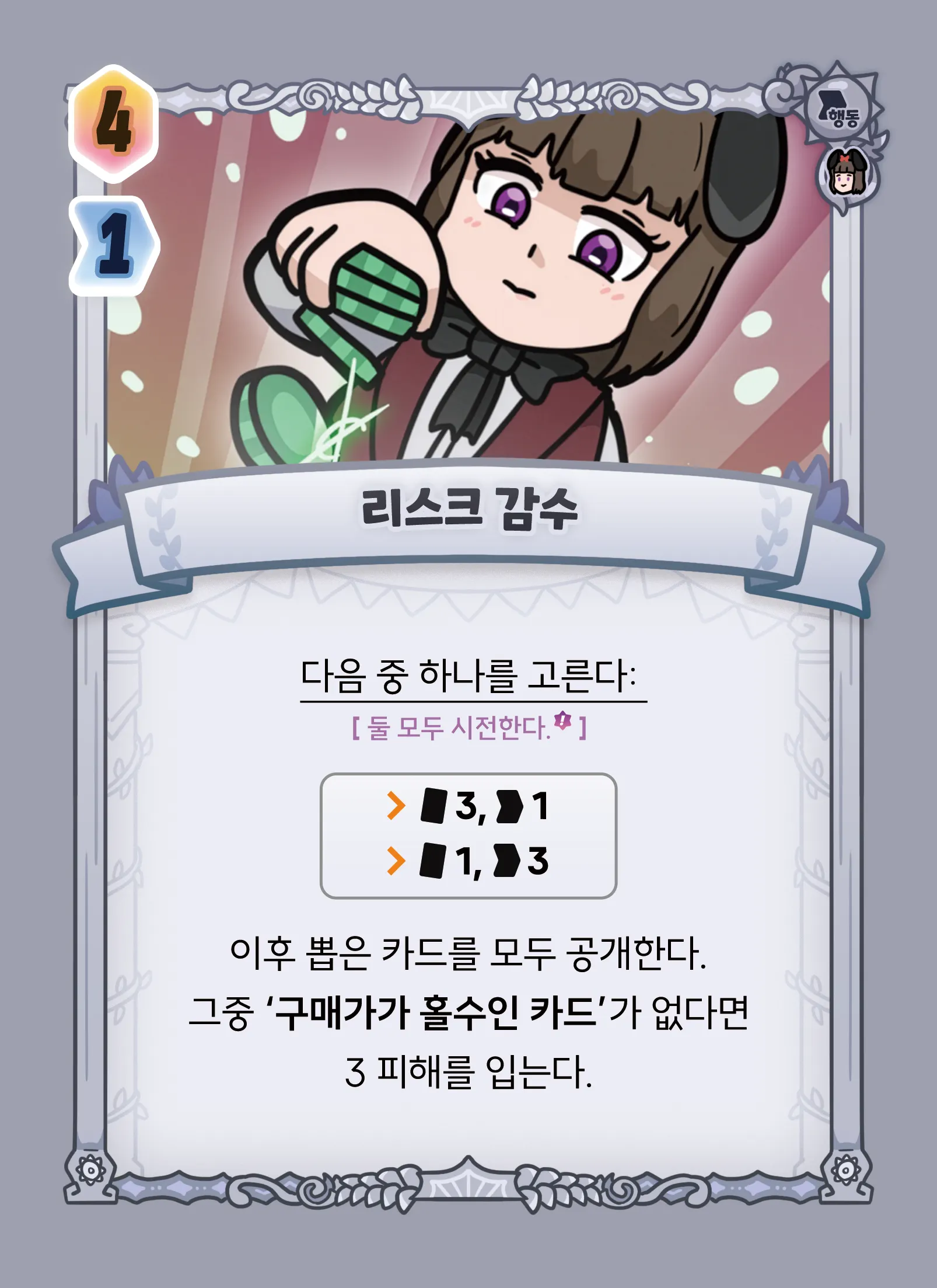 ■ +3 카드, +1 행동력 ■ +1 카드, +3 행동력 이후 뽑은 카드를 모두 공개한다. 그중 ‘구매가가 홀수인 카드’가 없다면 3 피해를 입는다.