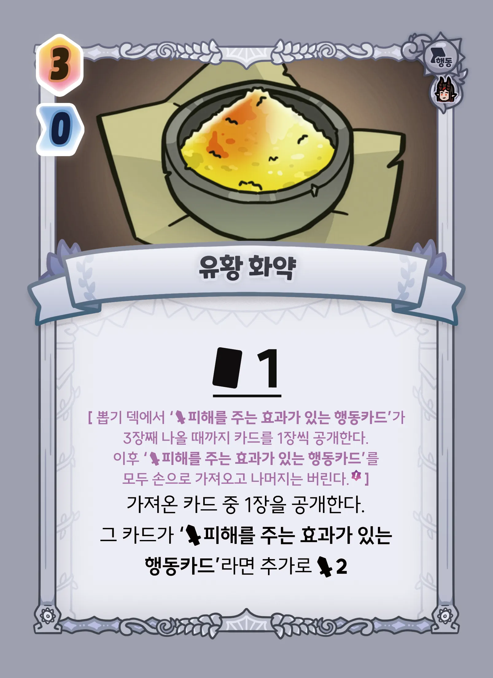 가져온 카드 중 1장을 공개한다. 그 카드가 ‘피해를 주는 효과가 있는 행동카드’라면 추가로 2 피해.