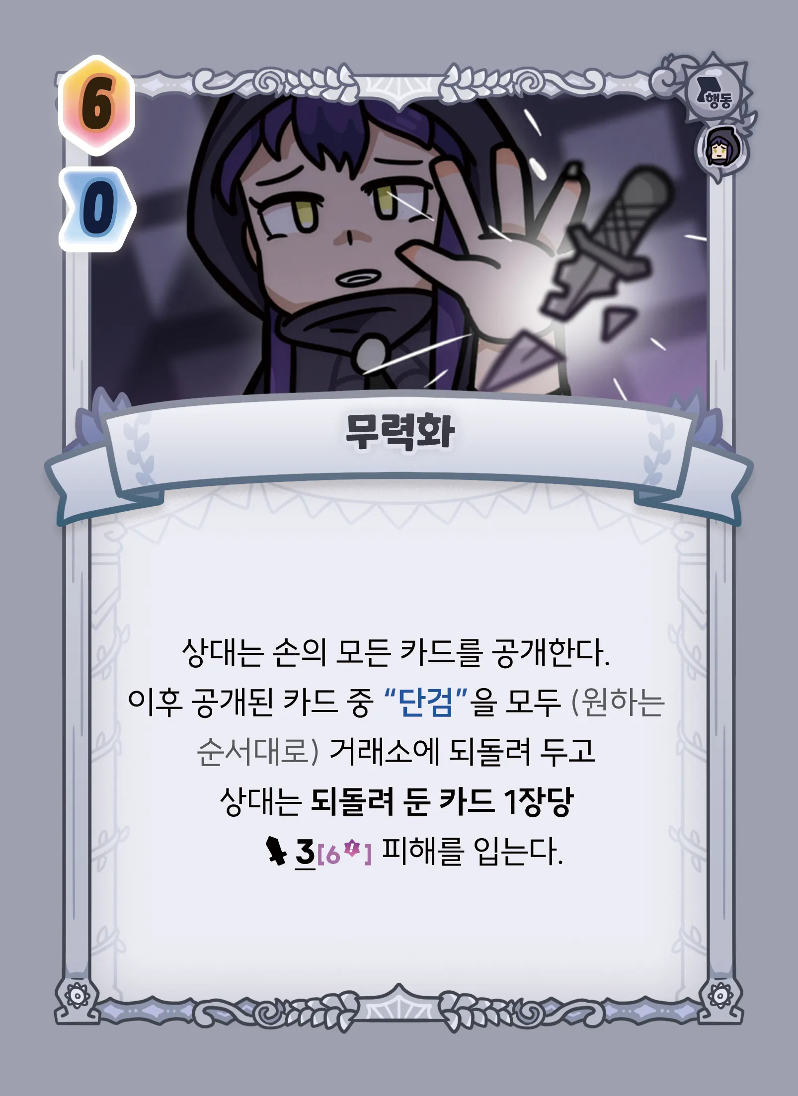 상대는 손의 모든 카드를 공개한다. 이후 공개된 카드 중 “단검”을 모두 (원하는 순서대로) 거래소에 되돌려 두고 상대는 되돌려 둔 카드 1장당