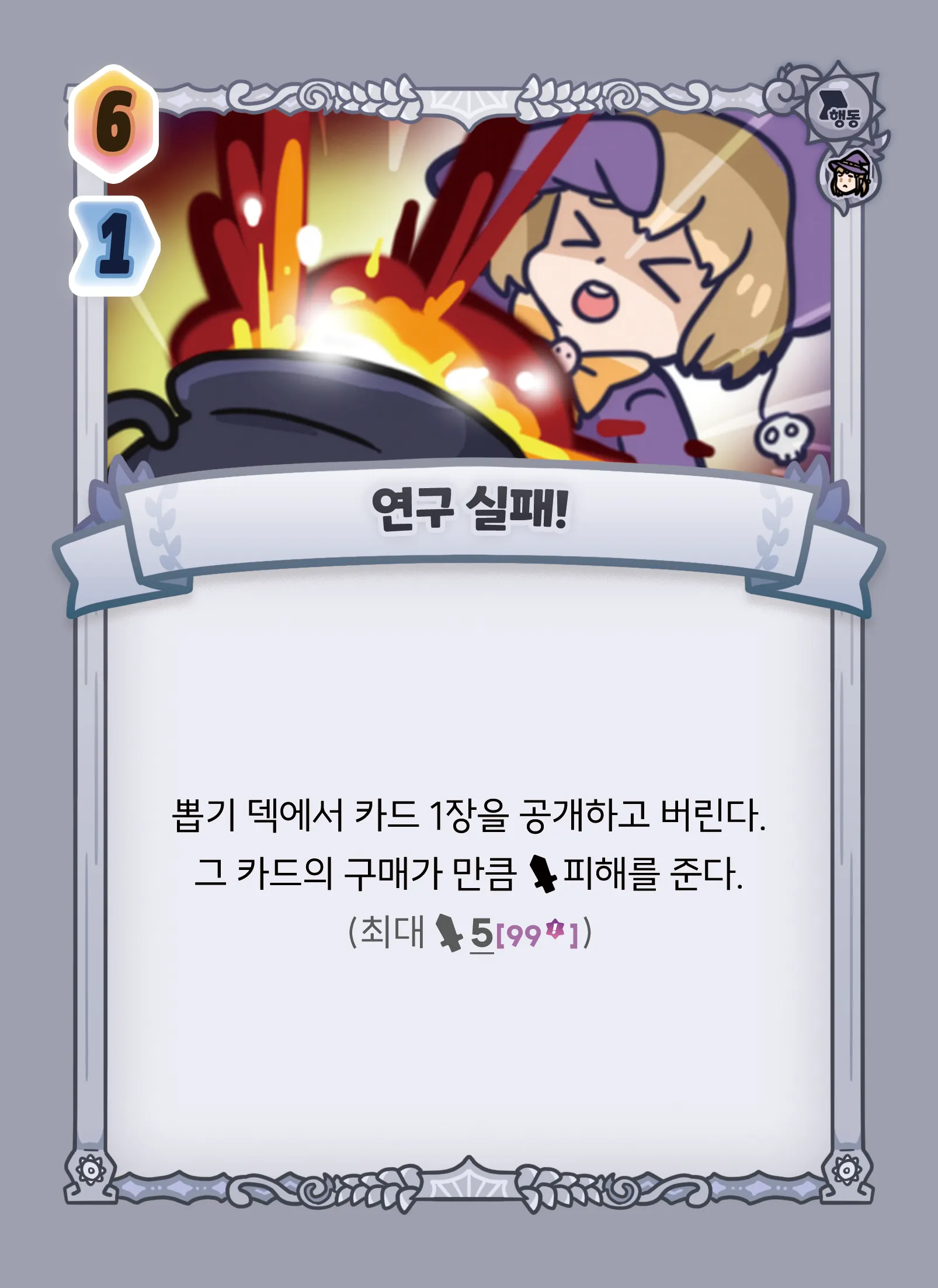 뽑기 덱에서 카드 1장을 공개하고 버린다. 그 카드의 구매가 만큼 피해를 준다. (최대