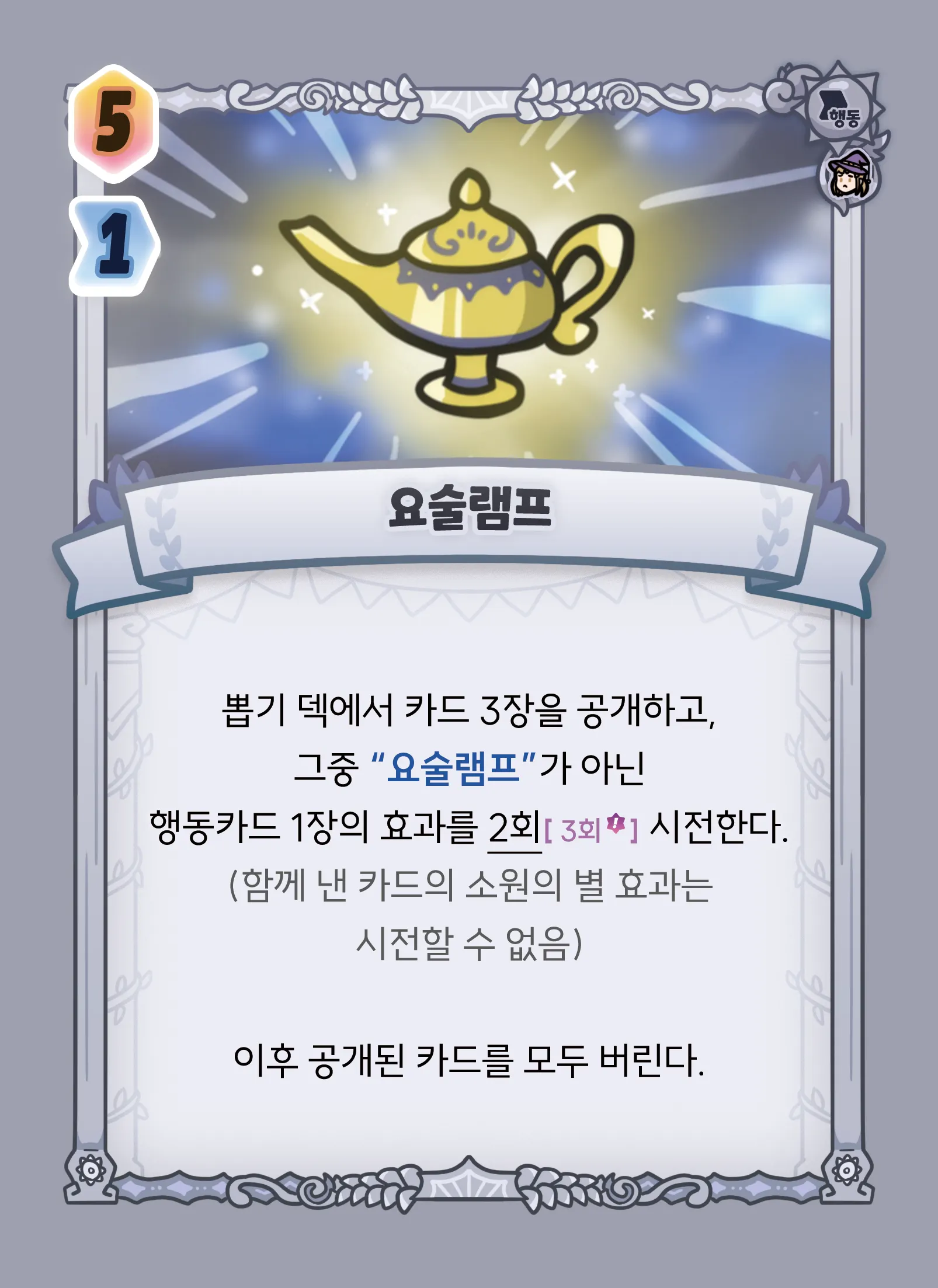 뽑기 덱에서 카드 3장을 공개하고, 그중 “요술램프”가 아닌 행동카드 1장의 효과를