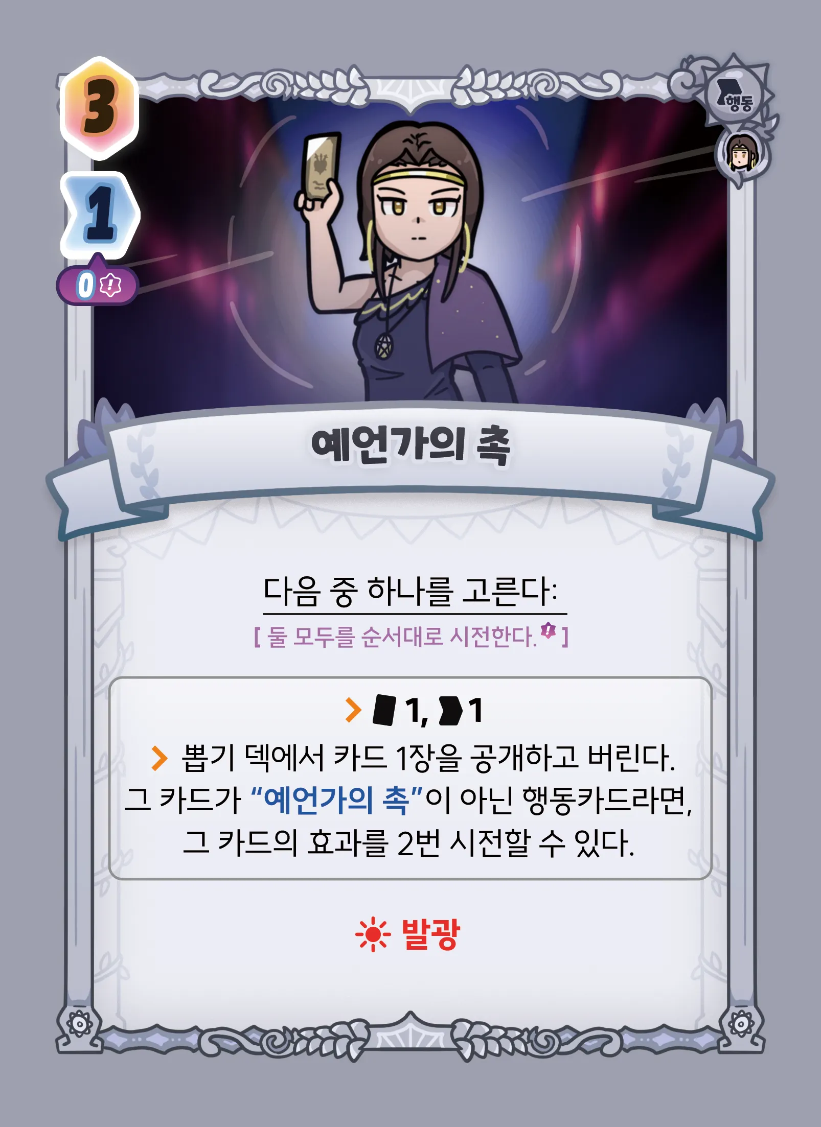 ■ +1 카드, +1 행동력, ■ 뽑기 덱에서 카드 1장을 공개하고 버린다. 그 카드가 “예언가의 촉”이 아닌 행동카드라면, 그 카드의 효과를 2번 시전할 수 있다.