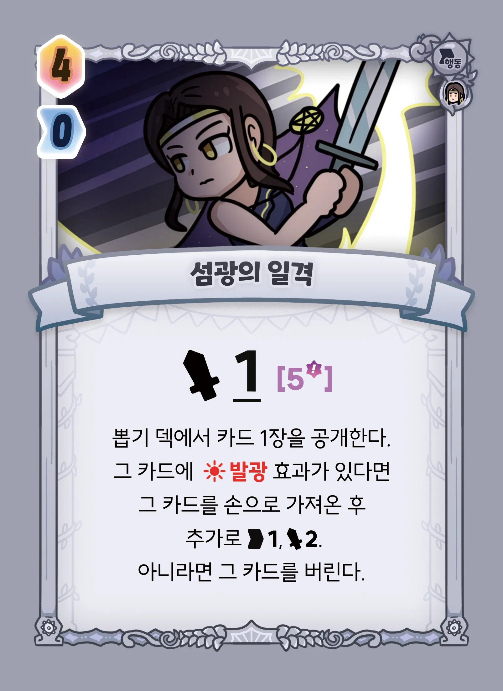 효과가 있다면 그 카드를 손으로 가져온 후 추가로 +1 행동력, 2 피해. 아니라면 그 카드를 버린다.