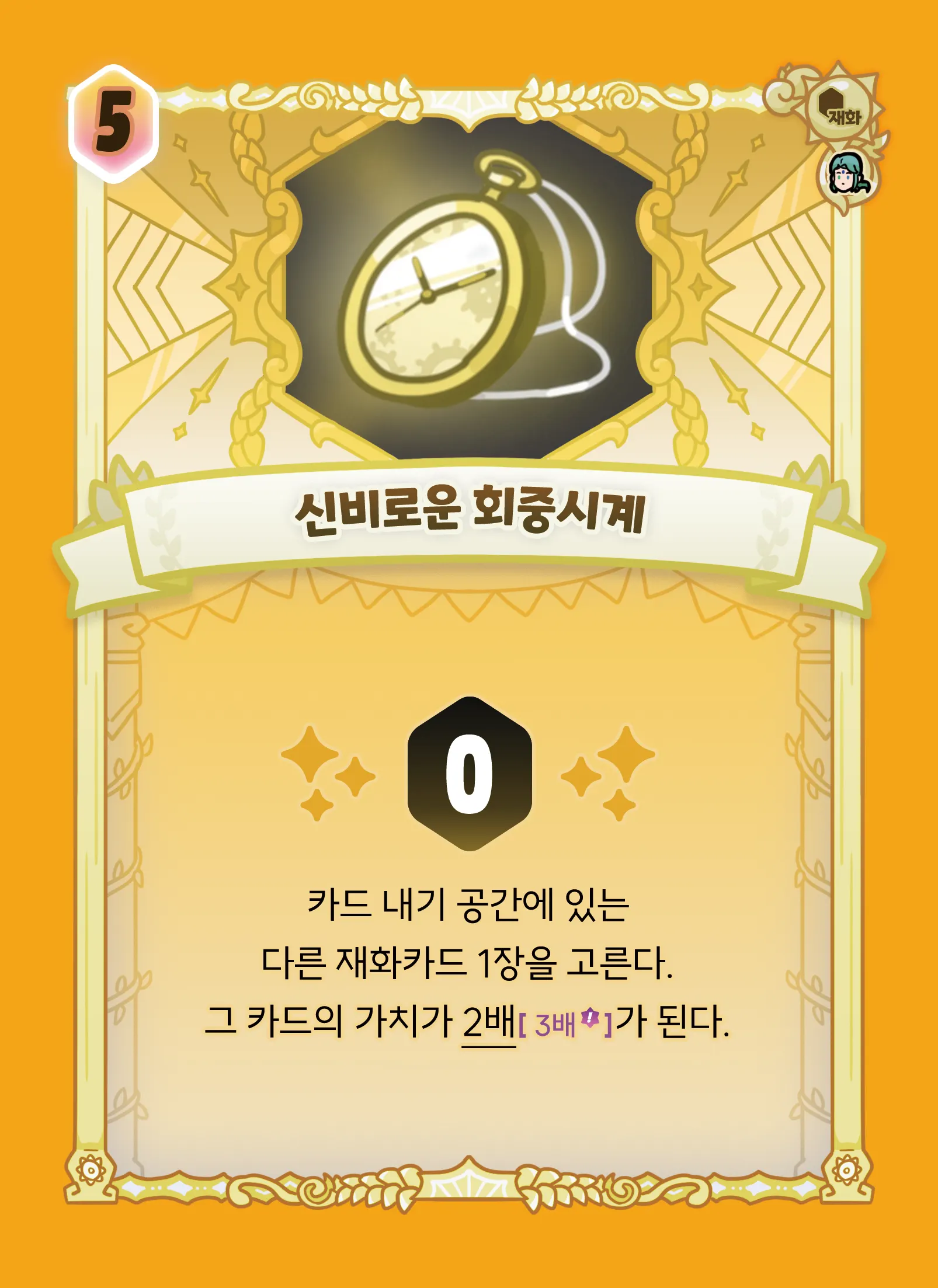 “신비로운 회중시계”를 여러장 냈다면, 한 카드에 “신비로운 회중시계”의 효과를 여러번 시전할 수도 있습니다. 그렇게 했다면 카드의 가치가 곱연산으로 계산됩니다. (2배, 4배, 8배, 16배..)