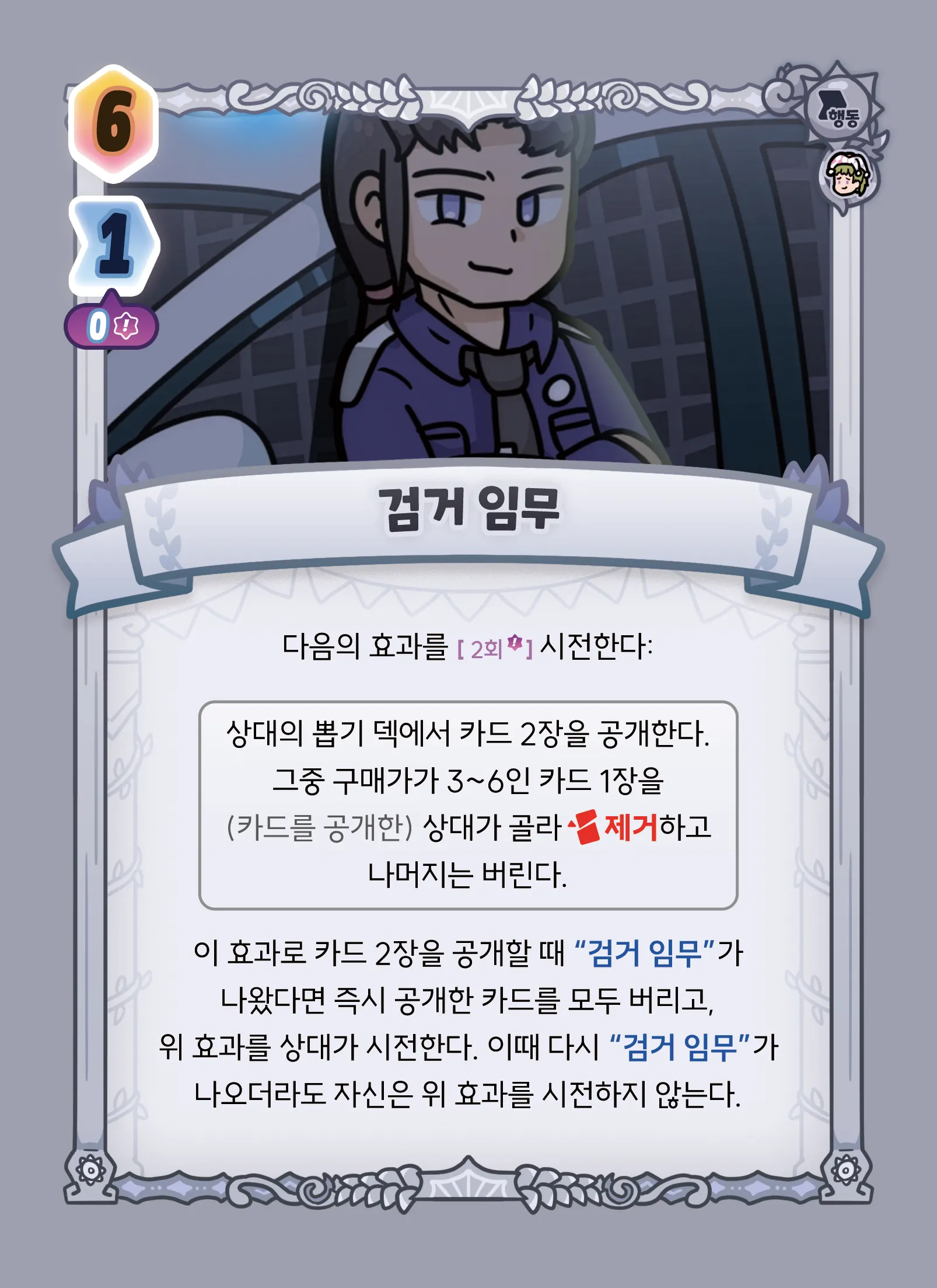 하고 나머지는 버린다. ] 이 효과로 카드 2장을 공개할 때 “검거 임무”가 나왔다면 즉시 공개한 카드를 모두 버리고, 위 효과를 상대가 시전한다. 이때 다시 “검거 임무”가 나오더라도 자신은 위 효과를 시전하지 않는다.