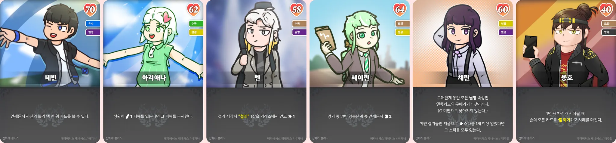 이후 그 캐릭터 중 이번 경기동안 사용할 캐릭터 1명을 선택해 내 자리 앞에 두면서 장착하고, 나머지 카드들은 경기장에서 삭제합니다.