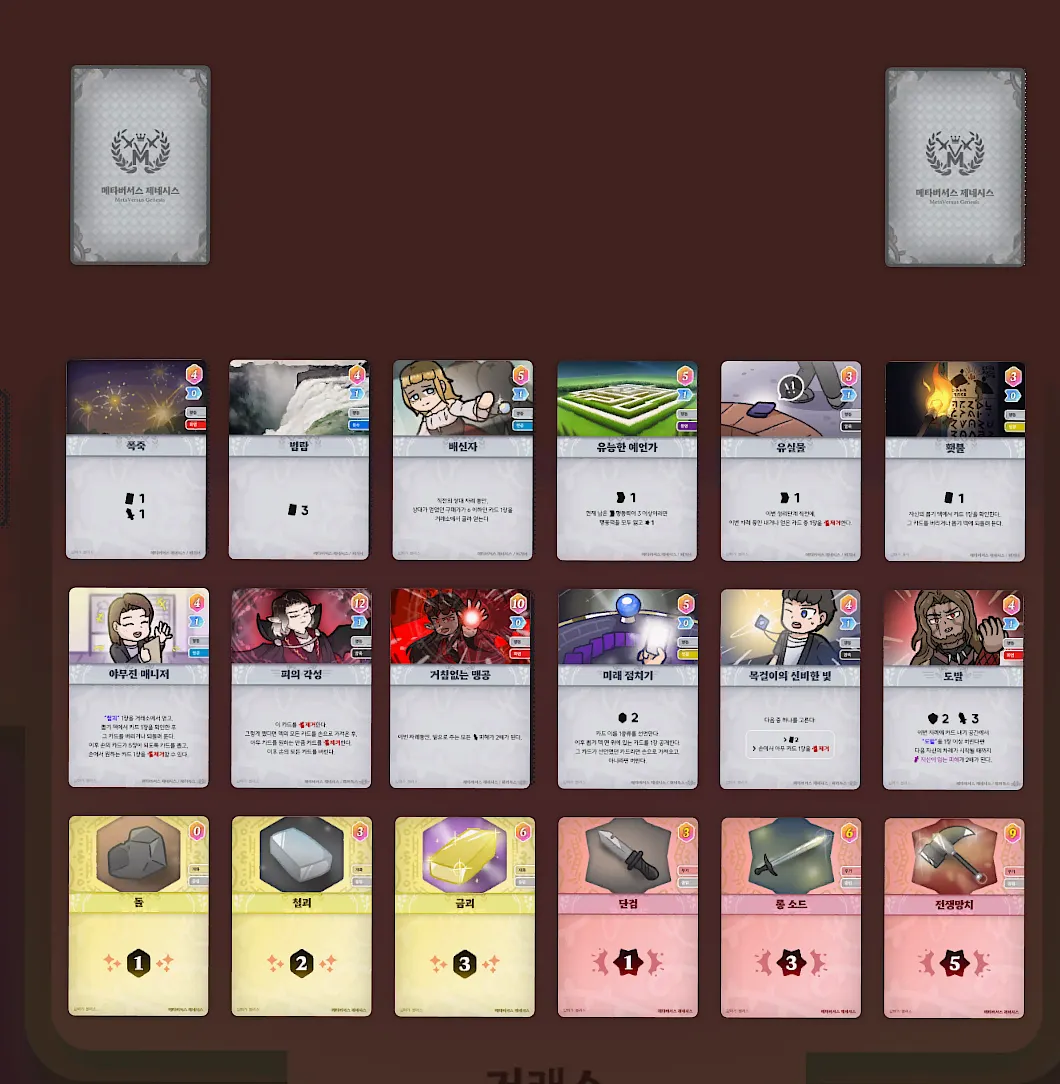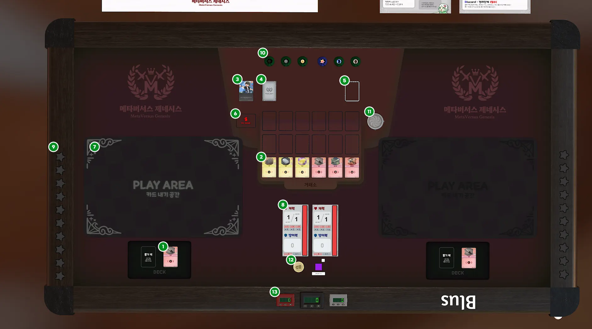최초의 메타버서스 시리즈인, 메타버서스 제네시스는 2명이서 1:1 대전으로 플레이하는 게임이며, Donald X. Vaccarino의 “도미니언” 보드게임에서 크게 영감을 받아 제작되었습니다. 이 게임은 카드로 구성된 ‘덱’을 게임을 진행하면서 만들어가는 “덱 빌딩 게임” 입니다. 처음으로 주어지는 덱엔 별로 좋지 않은 “돌” 과 “단검” 뿐이지만, 경기를 진행하면서 여러분의 전략에 따라 다양한 카드들로 덱이 만들어질 것입니다. 이러한 덱으로 비싼 카드를 구매하거나, 상대에게 큰 피해를 주는 등의 경기가 펼쳐질 것이며, 최종적으로는 상대보다 빨리 ‘상대의 체력을 0 이하로 만드는 것’ 또는 ‘10개의 스타를 모으는 것’을 목표로 게임을 진행하게 됩니다.