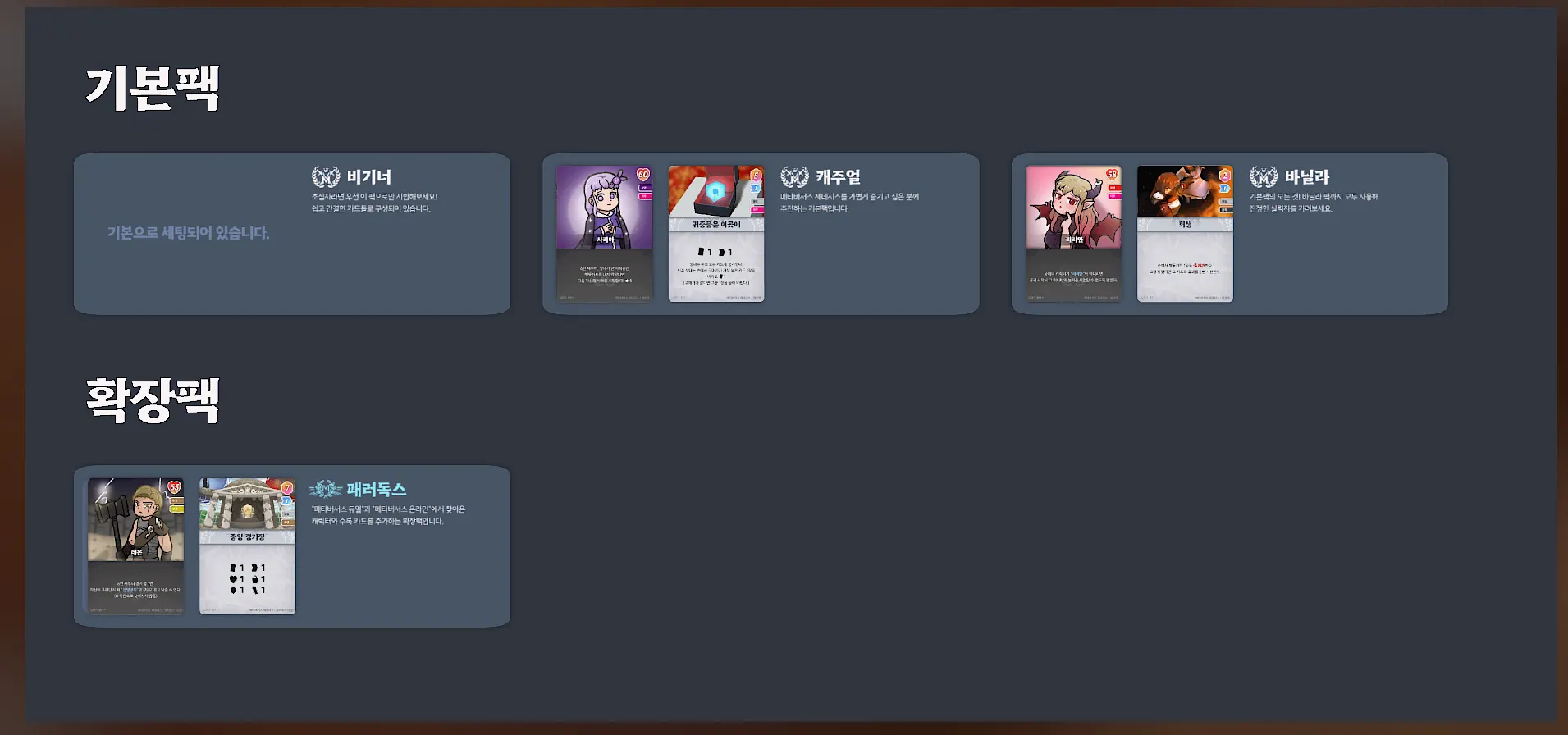 기본팩 (비기너+캐주얼+바닐라) | [캐주얼], [바닐라] 카드팩을 모두 가져옵니다. 이후 캐릭터 카드와 거래소 카드를 각각의 (캐릭터/거래소) 더미에 모두 섞어 넣습니다. |