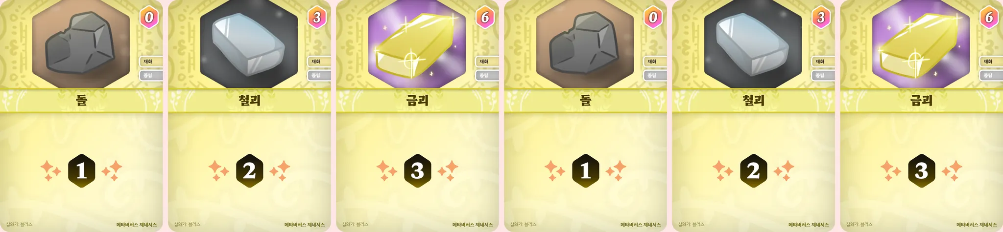 재화카드: 노란색과 육각형 틀로 이뤄진 카드