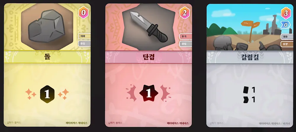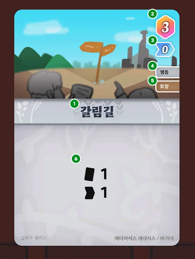 (3) 필요 행동력: 이 카드를 사용할 때 이 만큼의 행동력을 내야 합니다. 행동카드에만 적혀있고, 재화카드나 무기카드는 행동력을 사용하지 않아 적혀있지 않습니다.