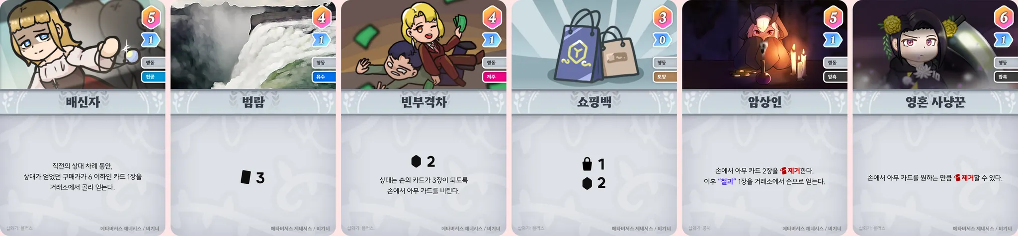 확장팩을 선택했다면 기본팩 거래소 카드더미, 확장팩 거래소 카드더미에서 각각 무작위로 6종류씩의 카드를 거래소에서 펼쳐주세요.