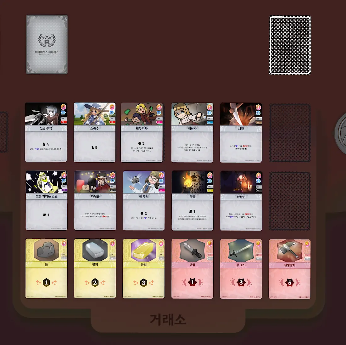 기본팩 (비기너+캐주얼) | [캐주얼] 카드팩을 가져옵니다. 이후 캐릭터 카드와 거래소 카드를 각각의 (캐릭터/거래소) 더미에 섞어 넣습니다. |