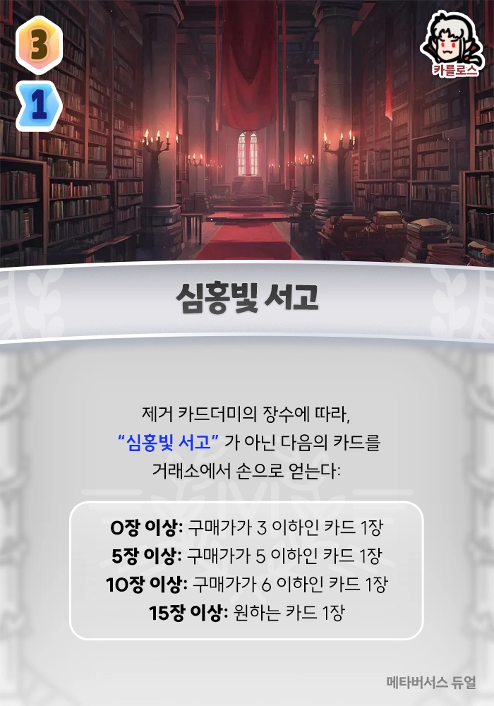 제거 카드더미의 장수에 따라, ”심홍빛 서고”가 아닌 다음의 카드를 거래소에서 얻는다: