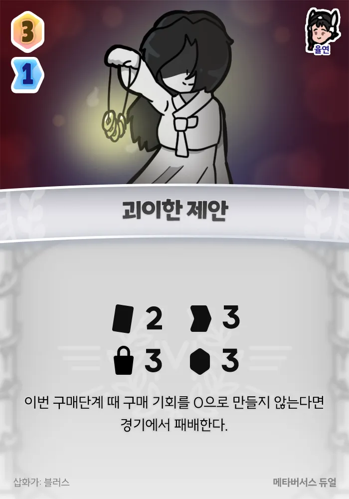 +2 카드, +3 행동력, +3 구매, +3 젬, 이번 구매단계 때 구매 기회를 0으로 만들지 않는다면 경기에서 패배한다.