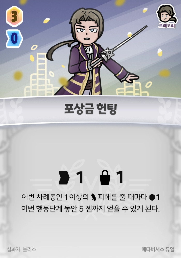 +1 행동력, +1 구매, 이번 차례동안 1 이상의 피해를 줄 때마다 +1 젬, 이번 행동단계 동안 5 젬까지 얻을 수 있게 된다.