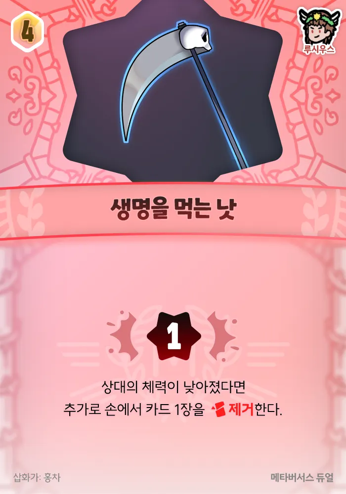 1 피해량, 상대의 체력이 낮아졌다면 추가로 손에서 카드 1장을