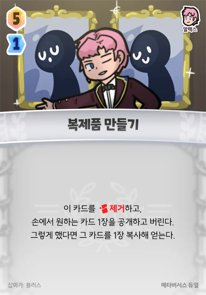 하고, 손에서 원하는 카드 1장을 공개하고 버린다. 그렇게 했다면 그 카드를 1장 복사해 얻는다.