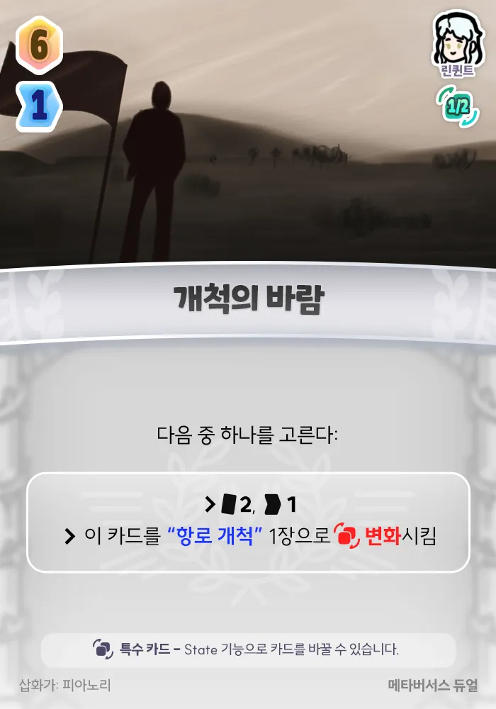 다음 중 하나를 고른다: ■ +2 카드, +1 행동력, ■ 이 카드를 “항로 개척” 1장으로