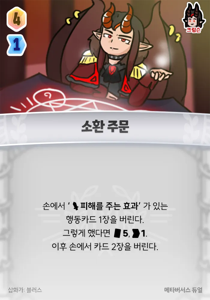손에서 ‘피해를 주는 효과’가 있는 행동카드 1장을 버린다. 그렇게 했다면 +5 카드, +1 행동력. 이후 손에서 카드 2장을 버린다.