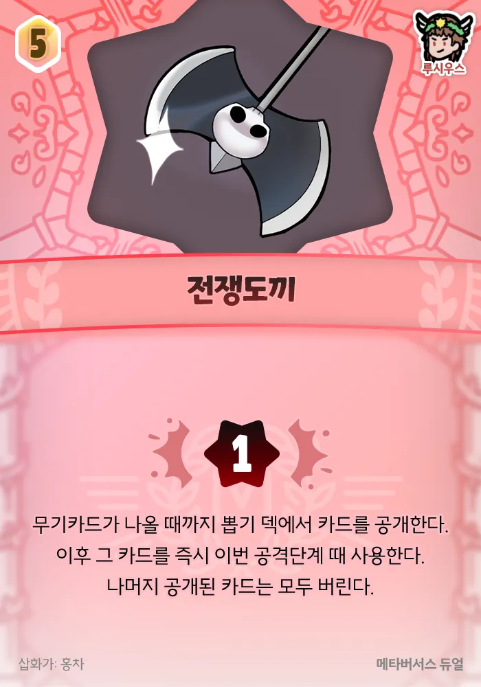 1 피해량, 무기카드가 나올 때까지 뽑기 덱에서 카드를 공개한다. 이후 그 카드를 즉시 이번 공격단계 때 사용한다. 나머지 공개된 카드는 모두 버린다.
