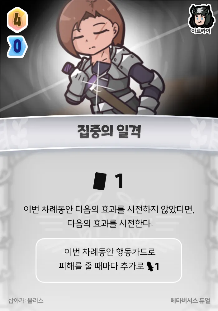 +1 카드, 이번 차례동안 다음의 효과를 시전하지 않았다면, 다음의 효과를 시전한다: [ 이번 차례동안 행동카드로 피해를 줄 때마다 추가로 1 피해. ]