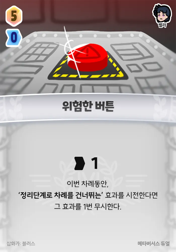 +1 행동력, 이번 차례동안, ‘정리단계로 차례를 건너뛰는’ 효과를 시전한다면 그 효과를 1번 무시한다.