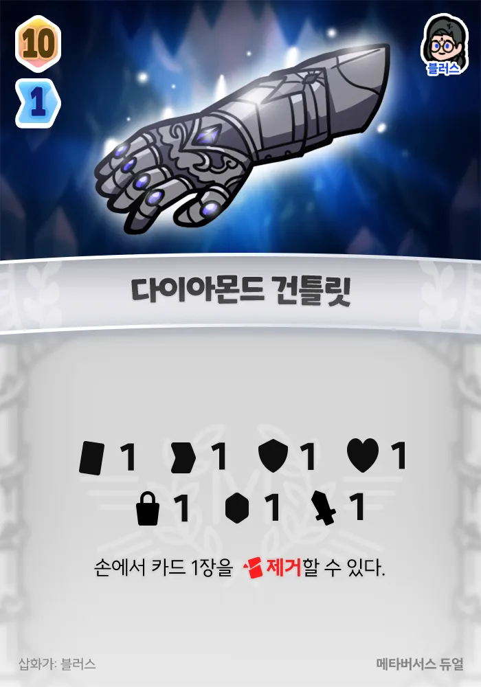 +1 카드, +1 행동력, +1 방어력, +1 체력, +1 구매, +1 젬, 1 피해, 손에서 카드 1장을