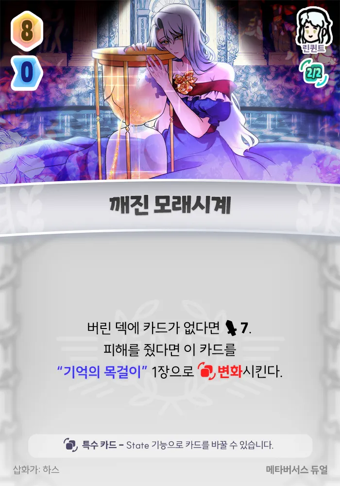 버린 덱에 카드가 없다면 7 피해. 피해를 줬다면 이 카드를 “기억의 목걸이” 1장으로