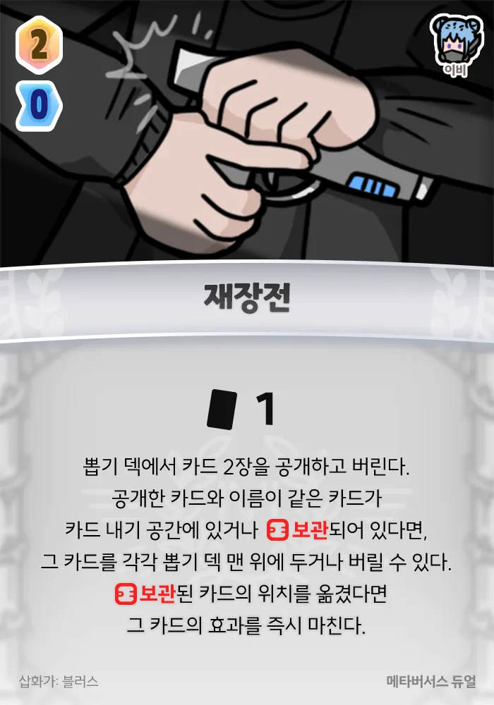 +1 카드, 뽑기 덱에서 카드 2장을 공개하고 버린다. 공개한 카드와 이름이 같은 카드가 카드 내기 공간에 있거나