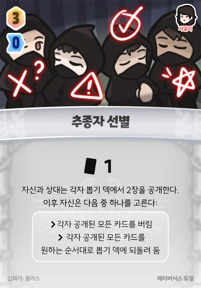 +1 카드, 자신과 상대는 각자 뽑기 덱에서 2장을 공개한다. 이후 자신은 다음 중 하나를 고른다: ■ 각자 공개된 모든 카드를 버림 ■ 각자 공개된 모든 카드를 원하는 순서대로 뽑기 덱에 되돌려 둠