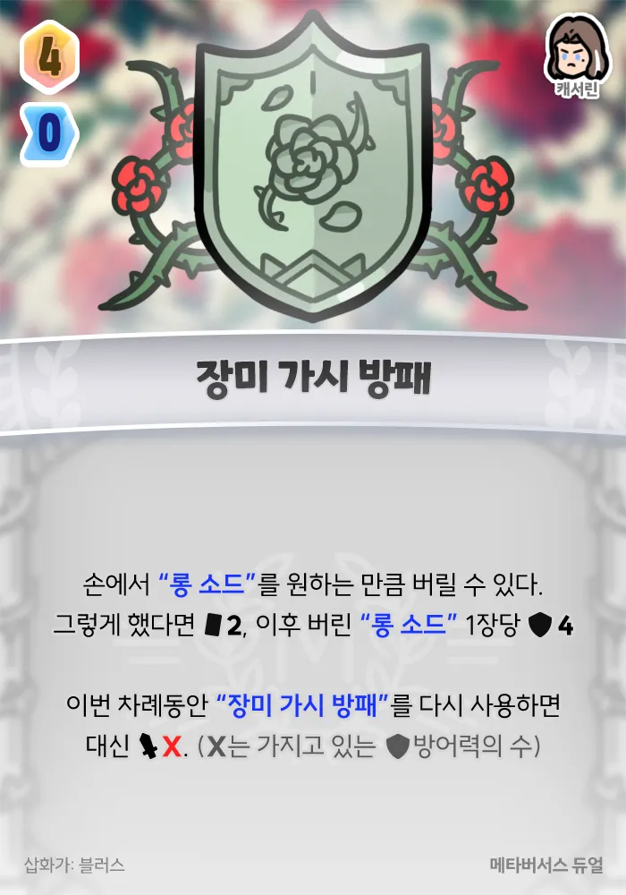 손에서 “롱 소드”를 원하는 만큼 버릴 수 있다. 그렇게 했다면 +2 카드, 이후 버린 “롱 소드” 1장당 +4 방어력. 이번 차례동안 “장미 가시 방패”를 다시 사용하면 대신