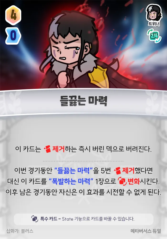 하는 즉시 버린 덱으로 버려진다. 이번 경기동안 자신이 “들끓는 마력”을 5번