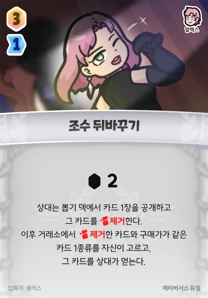 한 카드와 구매가가 같은 카드 1종류를 자신이 고르고, 그 카드를 상대가 얻는다.