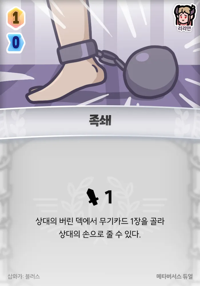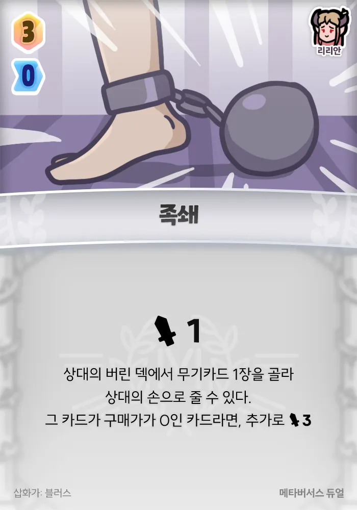 1 피해, 상대의 버린 덱에서 무기카드 1장을 골라 상대의 손으로 줄 수 있다. 그 카드가 구매가가 0인 카드라면, 추가로 3 피해