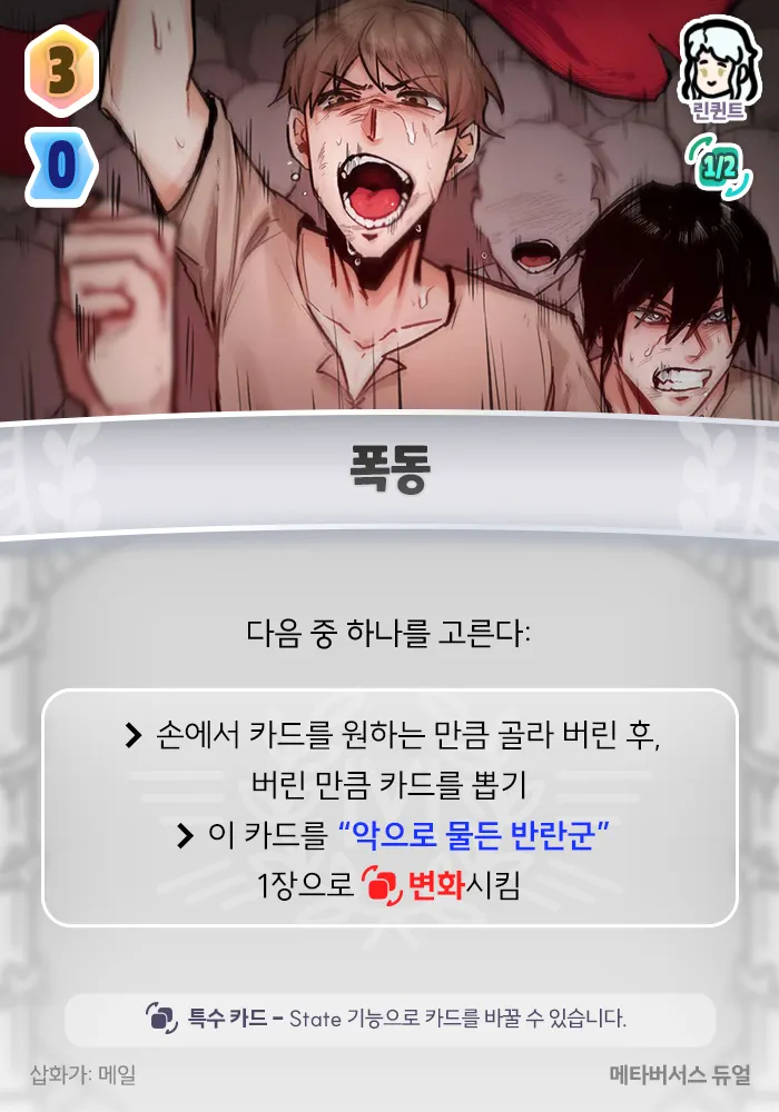 다음 중 하나를 고른다: ■ 손에서 카드를 원하는 만큼 골라 버린 후, 버린 만큼 카드를 뽑기 ■ +1 카드, 이 카드를 “악으로 물든 반란군” 1장으로