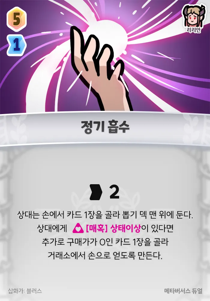 +2 행동력, 상대는 손에서 카드 1장을 골라 뽑기 덱 맨 위에 둔다. 상대에게