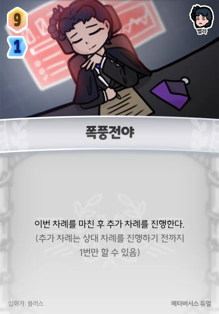 추가 차례는 상대 차례를 진행하기 전까지 1번만 할 수 있습니다. 추가 차레를 진행하는 중 ‘추가 차례를 진행합니다’ 효과를 또 시전하거나, 일반 차례를 진행할 때 효과를 2번 시전하더라도 추가 차례는 1번만 진행합니다.
