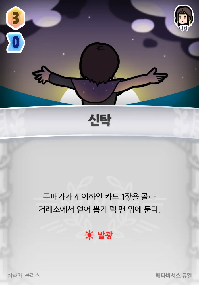 구매가가 4 이하인 카드 1장을 골라 거래소에서 얻어 뽑기 덱 맨 위에 둔다.