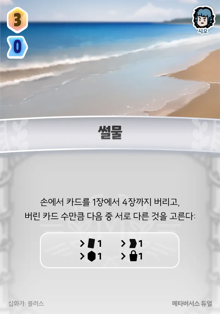 손에서 카드를 1장에서 4장까지 버리고, 버린 카드 수만큼 다음 중 서로 다른 것을 고른다: ■ +1 카드 ■ +1 행동력 ■ +1 젬 ■ +1 구매