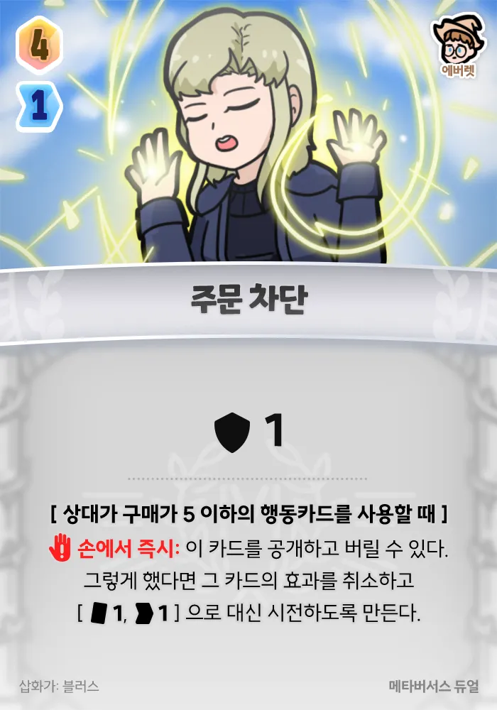 : 이 카드를 공개하고 버릴 수 있다. 그렇게 했다면 그 카드의 효과를 취소하고 [+1 카드, +1 행동력] 으로 대신 시전하도록 만든다.