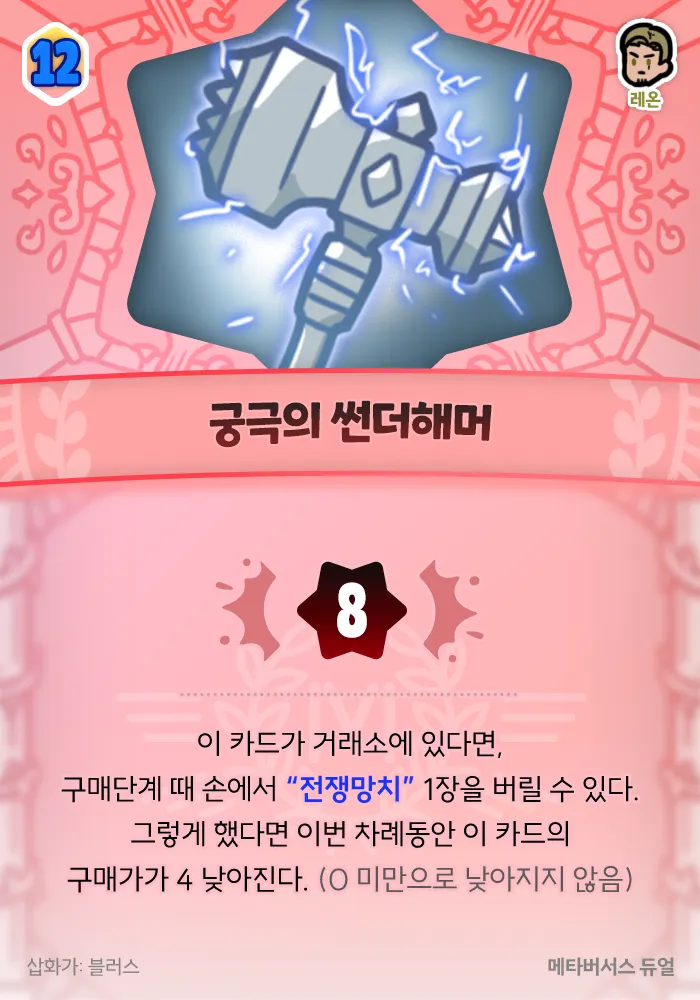이 카드가 거래소에 있다면, 구매단계 때 손에서 “전쟁망치” 1장을 버릴 수 있다. 그렇게 했다면 이번 차례동안 이 카드의 구매가가 4 낮아진다. (0 미만으로 낮아지지 않음)