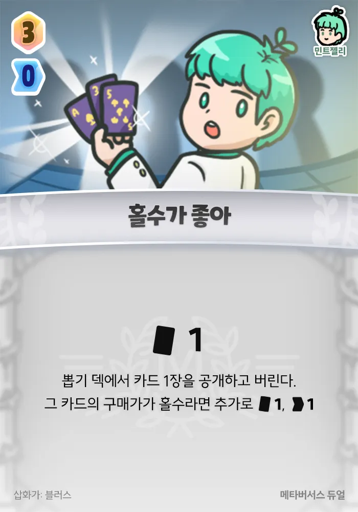 +1 카드, 뽑기 덱에서 카드 1장을 공개하고 버린다. 그 카드의 구매가가 홀수라면 추가로 +1 카드, +1 행동력