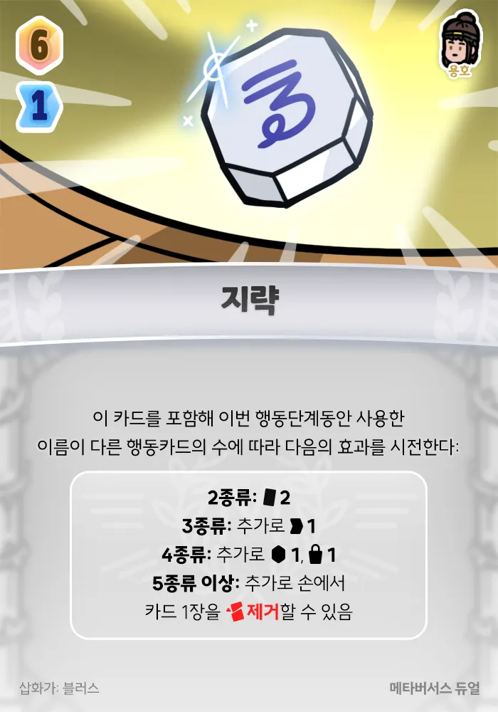 이 카드를 포함해 이번 행동단계동안 사용한 이름이 다른 행동카드의 수에 따라 다음의 효과를 시전한다: