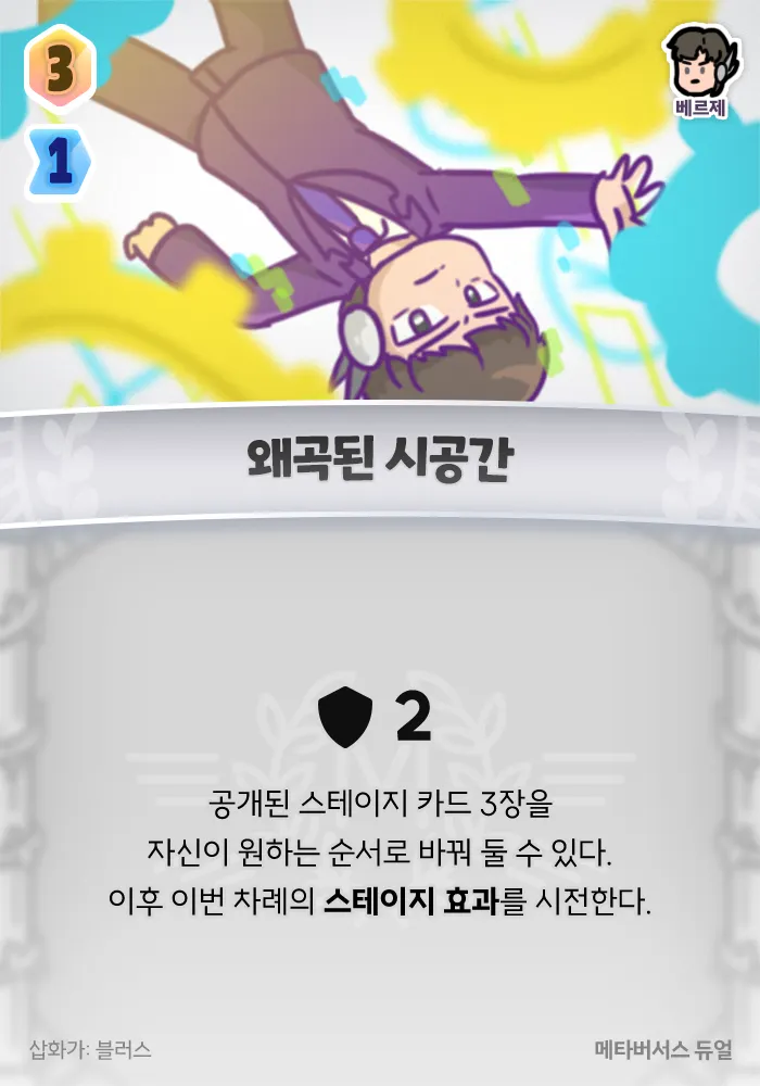 +2 방어력, 공개된 스테이지 카드 3장을 자신이 원하는 순서로 바꿔 둘 수 있다. 이후 이번 차례의