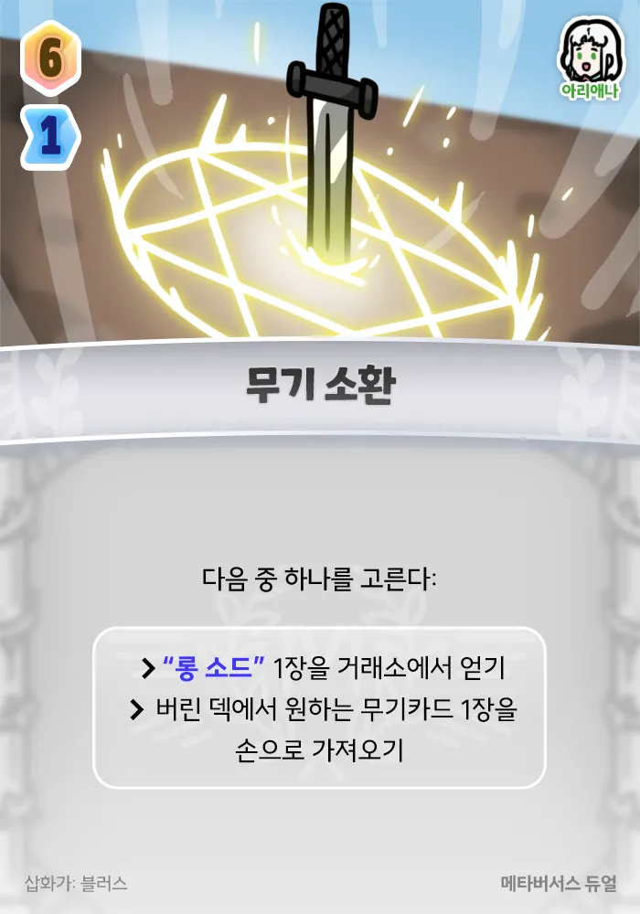 다음 중 하나를 고른다: ■ “롱 소드” 1장을 거래소에서 얻기 ■ 버린 덱에서 원하는 무기카드 1장을 손으로 가져오기